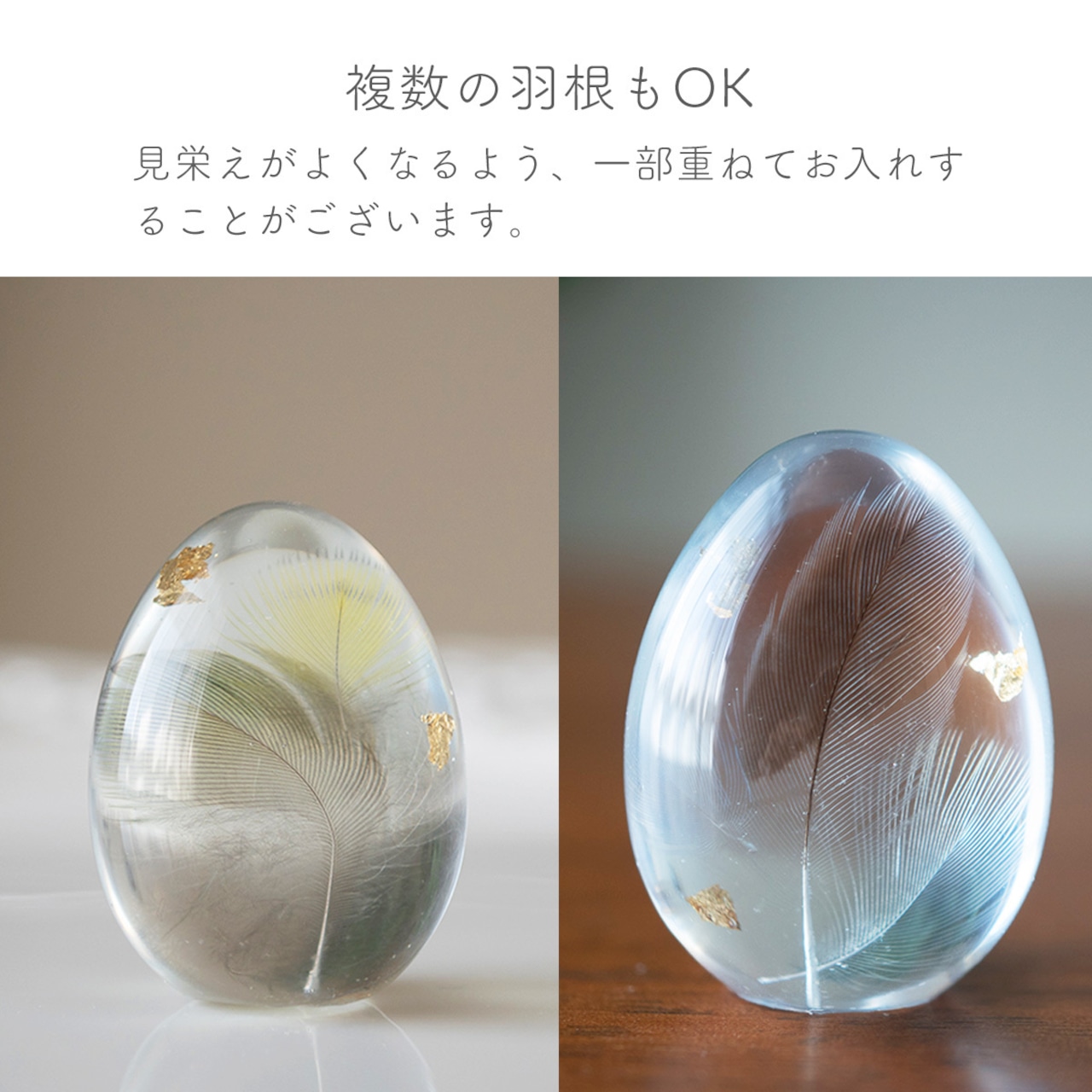 ・複数枚を入れる場合は、それぞれの羽根を離してしまうと、卵の中心に何もないような寂しい印象になるため、あえて重ねて配置する場合がございます。