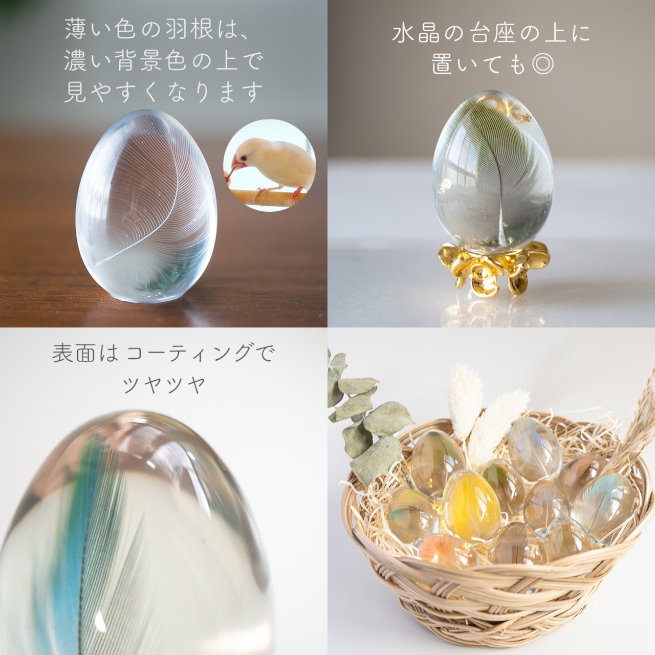 愛鳥さんの羽根が透明な卵の中に浮かぶ、可愛らしいオブジェです。