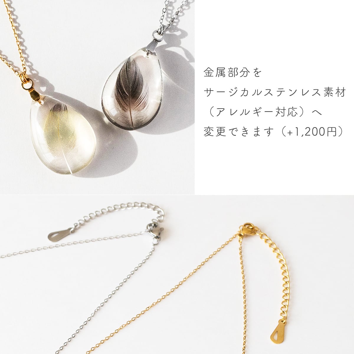 なお、ネックレスの長さの変更をご希望の場合、恐れ入りますがサージカルステンレスチェーンのご用意のみとなります。