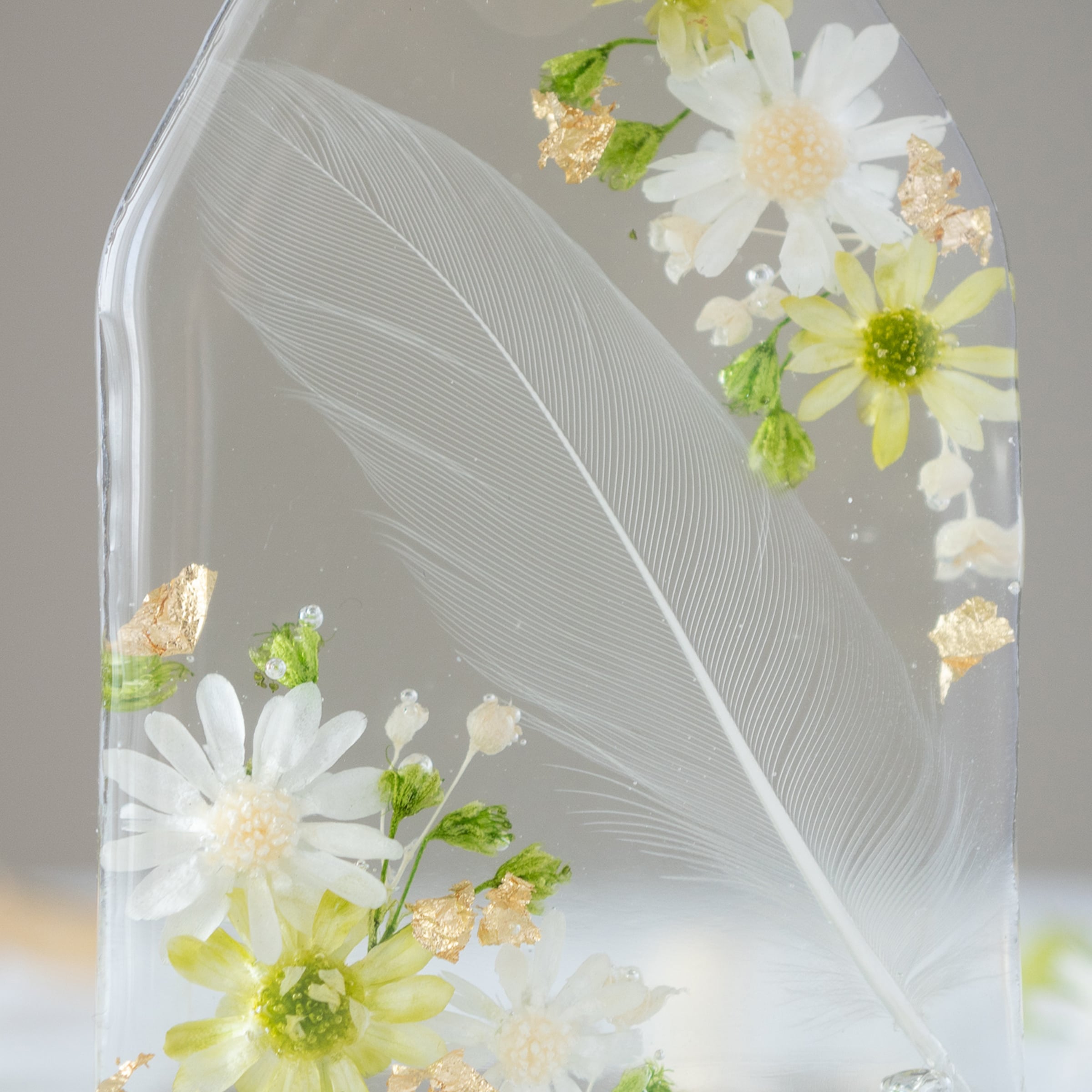 ・変色しにくいレジン液を使用していますが、一般的にレジンは経年劣化でゆるやかに黄色く変色する性質を持っています。また、花の色も時間の経過とともに徐々に褪せる可能性があります。いずれも特に直射日光により変色しやすい性質がございますので、直射日光の当たらない場所での保管をお勧めします。